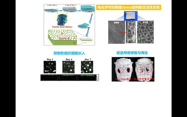 在结构/组成上具备各向异性的生物材料,可以提供更为丰富的功能,在医学领域的需求越来越大。生理性修复和再生需要调动周围健康细胞的再生达到修复,最后完全恢复机体组织原有的结构和功能。这一过程周期较长,往往被附近其它组织的快速增生和竞争性占位所干扰而失去再生的空间。在临床口腔及颌面外科的骨缺损治疗中,除了骨再生问题外,周围由纤维细胞快速增生引起的软组织竞争性占位问题也是临床常见问题。研究团队针对此临床问题,利用电化学手段可控构建了一种各向异性的Janus结构复合活性支架。通过材料表面拓扑结构差异化调控细胞行为,实现屏蔽软组织长入,同时诱导骨再生的双重活性功能。
