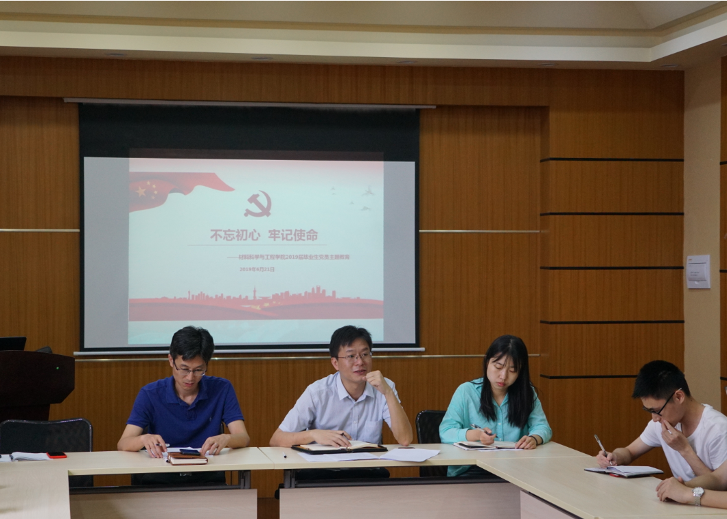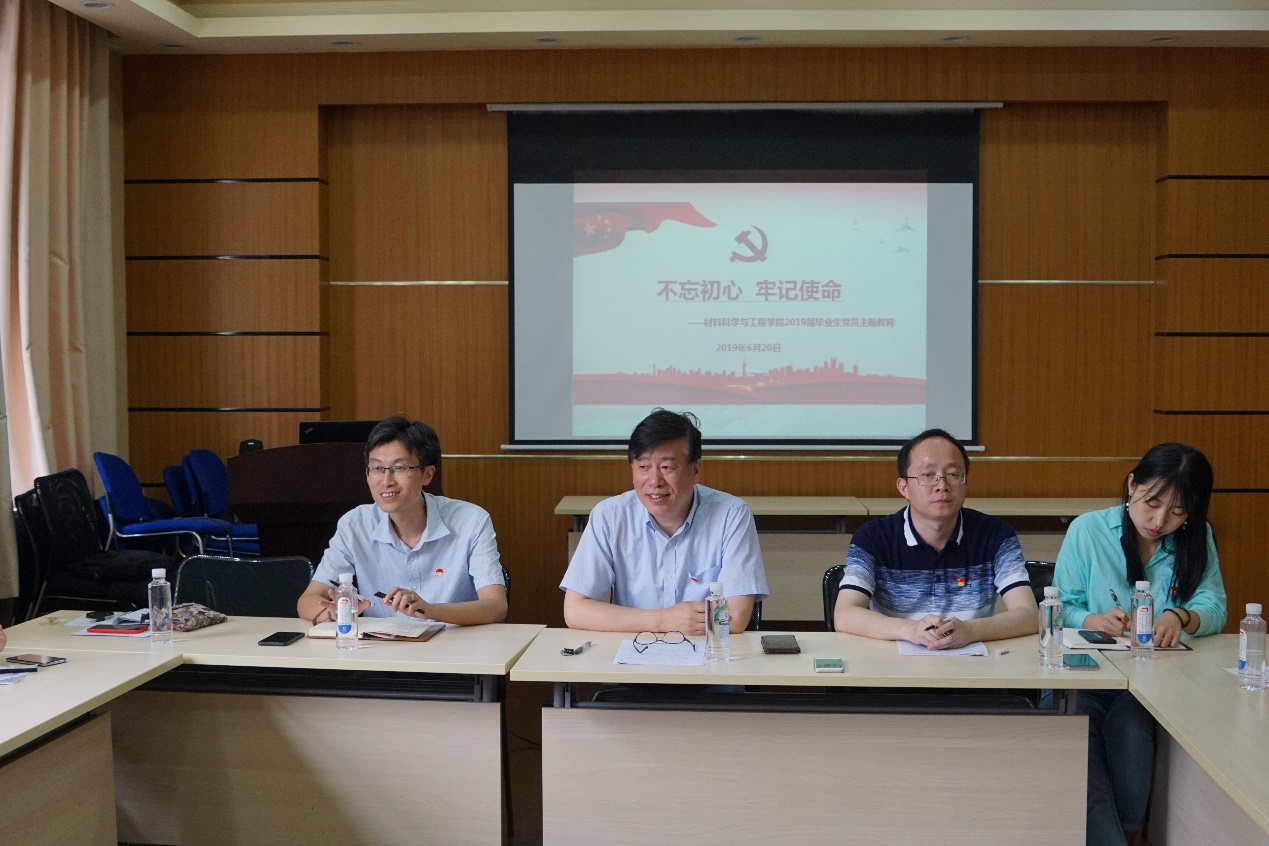 620日,材料学院党委书记唐颂超以“不忘初心、牢记使命”为主题给2019本科毕业生党员上离校前最后一次专题党课学院党委副书记戴诚安主持活动,毕业班辅导员参加。