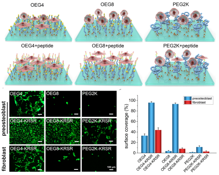 理想的医用生物材料植入人体后通过其表界面调控细胞行为,促进组织修复。源自生命体的功能性多肽可赋予材料表面生物活性并调控细胞行为,因此人们被广泛应用到生物材料研究和应用中。但是,其功能受到材料表面蛋白吸附等干扰和多肽表面接枝化学的影响,多肽修饰的材料表面,细胞调控功能可能展示不理想甚至与实际功能相背离,严重影响多肽功能的发挥并阻碍新功能多肽分子的发现。本研究系统探索了基于聚乙二醇(PEG)的抗粘附分子对材料表面活性多肽细胞调控功能的影响,发现中等链长的PEG分子能够极大的降低材料表面背景干扰、并能充分展示多肽的功能。太短和太长的PEG分子都不利于展示和优化材料表面多肽的细胞调控功能。这一研究,揭示了在生物材料表/界面领域一个长期遗留但极其重要的关键问题,并阐明其中原因,助力于医用生物材料的研究和应用。