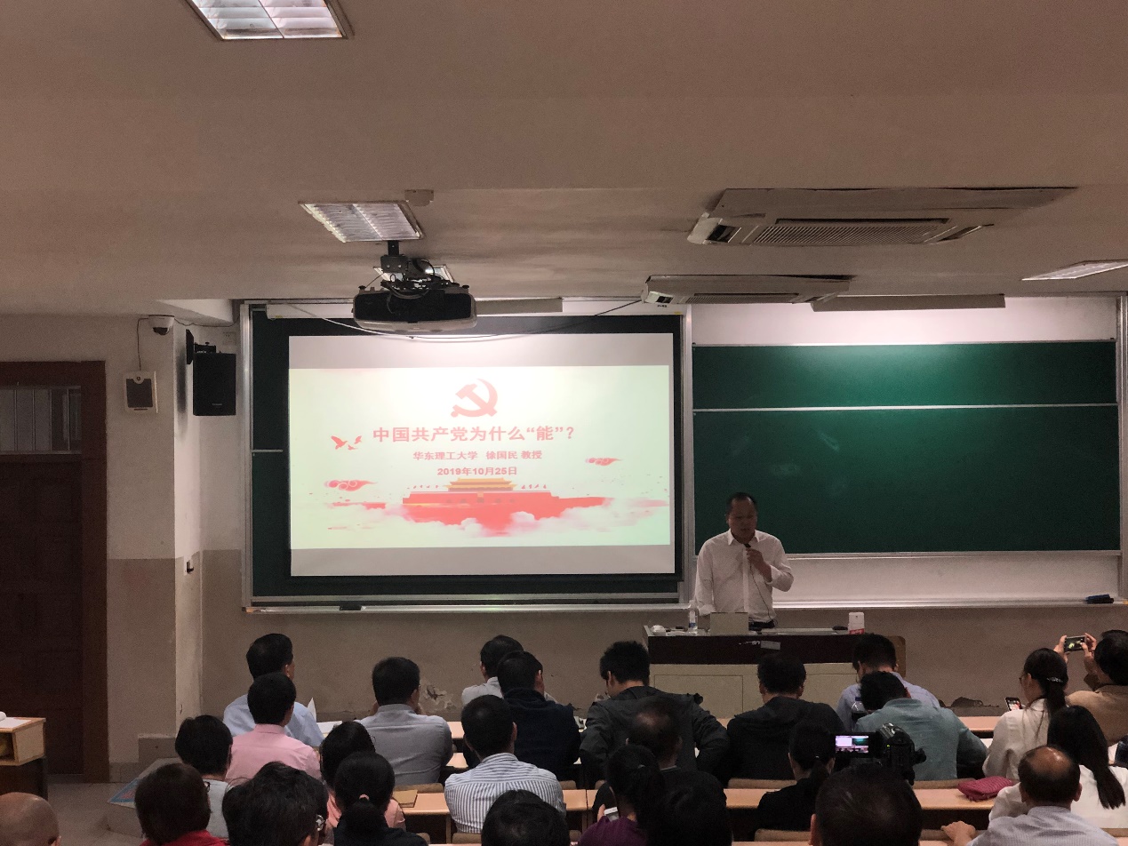 随后,徐国民教授应邀作题为“中国共产党为什么“能””的专题辅导报告。徐国民首先从中国数千年的历史发展进程、中国的文化和国情分析得出:民族团结,国家统一是历史发展的主流,只有中国共产党,这个代表中国最广大人民根本利益的先进政党才能带领全国人民进行社会革命,走向繁荣富强。中国共产党的先进性和纯洁性使它能成为始终走在时代前列、经得起各种风浪考验、朝气蓬勃的马克思主义执政党。接着,徐老师指出我国正处于并将长期处于社会主义初期阶段,我们要按照习近平总书记的要求,深刻认识和准确把握外部环境的变化和我国改革发展稳定面临的新情况新问题新挑战,要始终保持忧患意识,不断全面从严治党。为决胜全面建成小康社会、夺取新时代中国特色社会主义伟大胜利、实现中华民族伟大复兴的中国梦提供坚强保障。