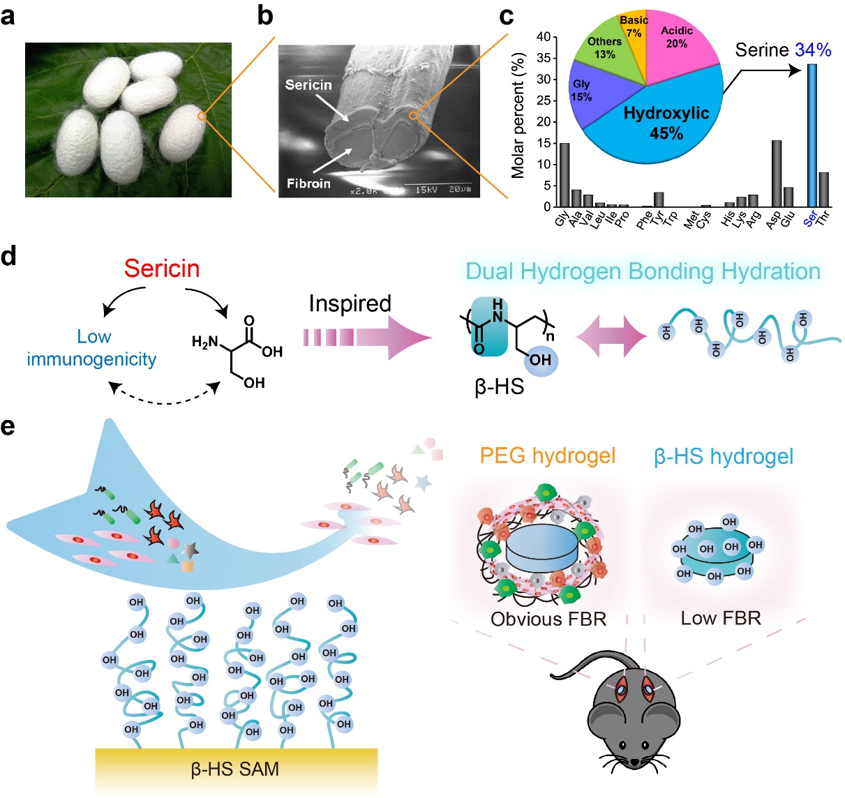 近日,yl23455永利官网刘润辉教授课题组报道受蚕丝蛋白启发,设计获得了的结构简单、生物相容性好、体内稳定的一类新的抗粘附和抗植入异物反应高分子材料:聚β-丝氨酸。聚β-丝氨酸修饰的表面能够高效抵制多种蛋白吸附、血清污染、细胞、血小板和多种微生物粘附;聚β-丝氨酸水凝胶植入小鼠体内1周到3个月后未发现明显异物反应,明显优于出现显著异物反应的PEG植入对照组。作者首次提出“双重氢键水化”的假设来解释聚β-丝氨酸优异的抗粘附和抗植入异物反应性能,并通过计算模拟加以验证。这类新型抗粘附和抗植入异物反应高分子材料有望用于解决临床中普遍存在的植入材料异物反应难题,在植入材料和装置、药物递送等多个相关领域有广阔的应用前景。