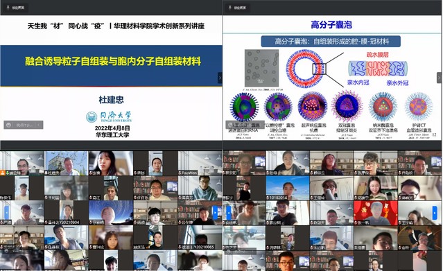48日下午,材料学院举办第三场“天生我‘材’,同心战‘疫’”学术创新讲座。本次讲座由材料学院副院长顾金楼教授主持,邀请国家杰出青年科学基金获得者,同济大学特聘教授杜建忠,作“融合诱导粒子自组装与胞内分子自组装材料”主题讲座。