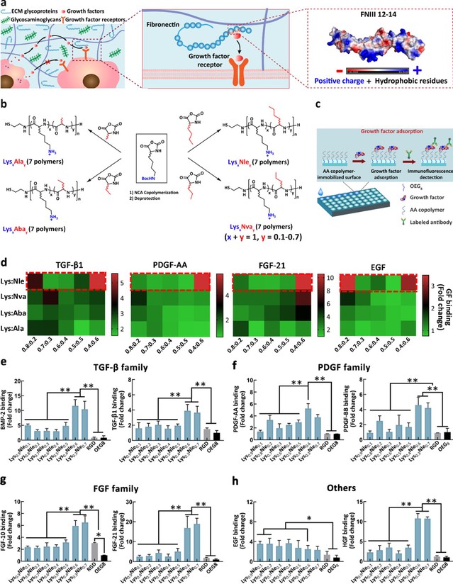 生长因子是一类通过与细胞表面受体结合、调控细胞行为从而具有组织再生功能及生物调节功能的细胞因子,在生物系统中发挥着重要作用。但生长因子在体内易被蛋白酶解,从而迅速失活,因此在临床应用中生长因子的剂量急剧增加,这导致了成本升高和严重副作用。在生理条件下,细胞外基质中纤连蛋白可直接与生长因子结合,以储存的方式保护生长因子免受蛋白酶降解,调控生长因子释放的时间及空间。此外,纤连蛋白结合的生长因子仍能与它们的受体结合,从而阻止细胞内吞并延长细胞内信号传导。受纤连蛋白的生长因子结合功能启发,通过无规共聚物去模拟具有特定序列和结构的纤连蛋白,设计并获得了可高效模拟纤连蛋白普适性结合生长因子功能的氨基酸无规共聚物。优选聚合物与生长因子的结合能力已经接近于纤连蛋白与生长因子的结合能力。这一设计思路打破了传统模拟功能蛋白与受体蛋白相互作用依赖天然蛋白氨基酸序列模板,通过蛋白片段或者经氨基酸替换或者改造的序列可控多肽模拟蛋白的设计思路,摆脱了对原有功能蛋白中氨基酸序列模板的依赖,可实现快速构建功能蛋白模拟聚合物及实现与受体蛋白的高效结合,并展示相应的生物学功能。