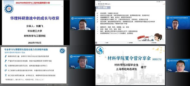 研究生办公室负责人陈亚琴详细讲解了此次夏令营的基本情况、优秀营员的选拔规则、注意事项以及接收2023年推荐免试生的情况。随后,材料学院举办了优秀校友分享会,上海市青年五四奖章获得者刘鹏飞特聘副研究员,上海市优秀毕业生、现任职巴斯夫电池材料事业部技术投资经理张浩轩校友,原校研究生会副主席、现就职壳牌(中国)有限公司韩磊校友,原材料学院研究生会主席姜宁校友结合自身在华理学习成长经历,与营员们分享了导师选择、科研攻关、实习就业等方面的心得与体会,加深了营员们对攻读材院研究生的浓厚兴趣。
